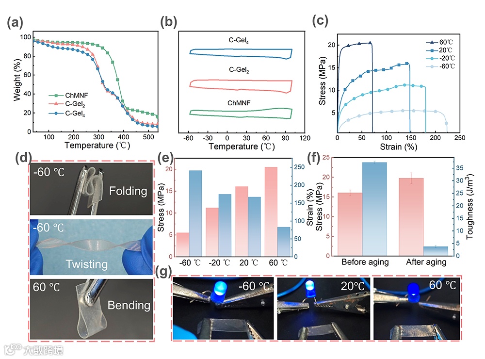 热重分析(TGA)和差示扫描量热法(DSC)证实了材料良好的热稳定性与抗冻特性。力学性能测试表明,在-60 °C至60 °C的极端温度范围内,C-Gel4的拉伸强度始终高于5.3 MPa,断裂伸长率超过220%,韧性在极端高低温下仍分别保持13.86 MJ/m³和10.65 MJ/m³。