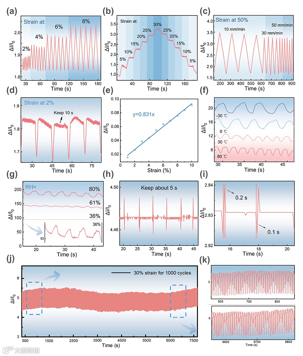 基于C-Gel的传感器表现出多模态传感能力。在应变传感方面,其对小至2%、大至50%的应变均能产生灵敏、可逆且重复性良好的电流响应(ΔI/I₀),在1%-10%应变区间内呈现线性响应(GF ≈ 0.831),且在1000次30%应变循环后信号稳定。同时,该传感器对温度(25-85 °C)、湿度(36%-80% RH)和紫外线均能产生快速、明显的响应信号,其中对UV照射的响应和恢复时间分别仅为0.2秒和0.1秒。