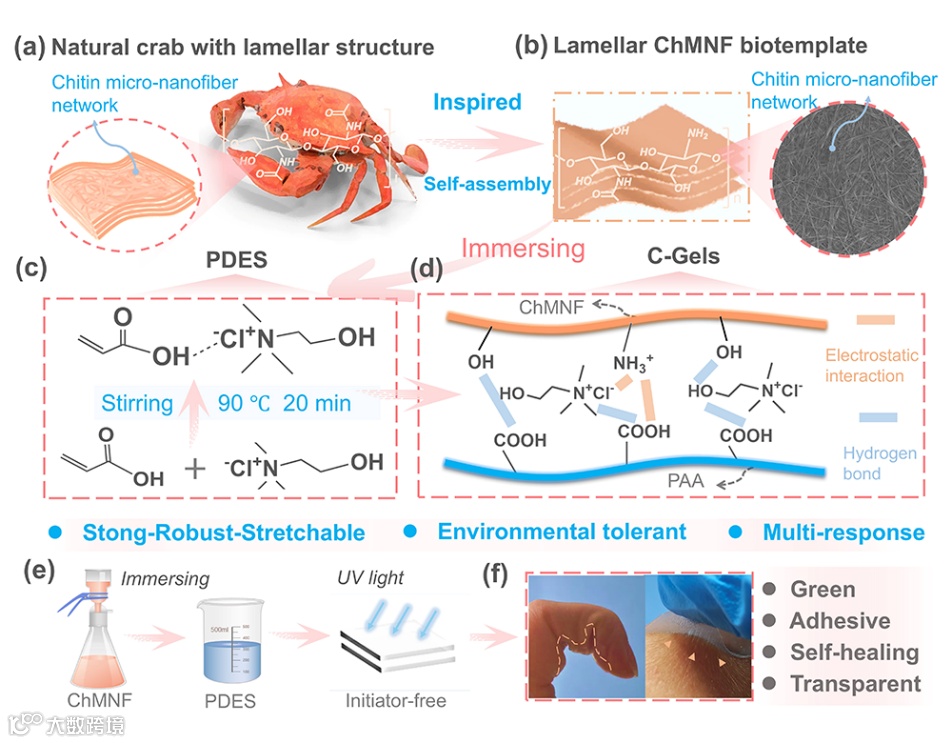 自然界中,蟹壳由甲壳素纳米纤维与蛋白质形成有序的层状复合结构,通过氢键等分子作用实现高强度与高韧性的统一。受此启发,研究团队从废弃蟹壳中提取并构建了具有三维层状结构的甲壳素微纳米纤维(ChMNF)生物模板,随后引入绿色可聚合深共熔溶剂(PDES,丙烯酸/氯化胆碱),在无需任何化学引发剂与交联剂的条件下,通过一步紫外光聚合,成功制备出仿生复合凝胶(C-Gels)。