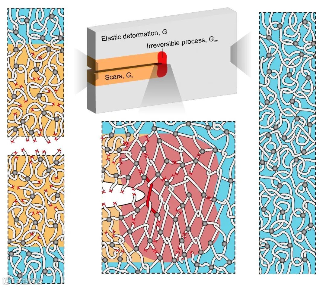 材料在受力时会因为裂纹扩展而发生断裂、撕裂或剥离。对于高分子网络而言,这一过程通常伴随着高分子链上共价键的断裂,在裂纹尖端形成局部损伤,在裂纹穿过时留下两层“疤痕”,而其余部分则发生弹性变形。那么,裂纹扩展的驱动力是什么?材料抵抗裂纹扩展的能力如何量化?其背后关联的分子机制又是怎样的?