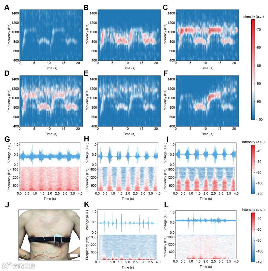在听诊感知模式下,器件利用LIG的压阻效应读出实现声学信号的敏感转换,并通过谐振匹配对弱的高频病理心音成分进行选择性增强,从而提升可穿戴听诊在复杂噪声环境下的有效信息占比,为后续智能识别提供更清晰的输入。
