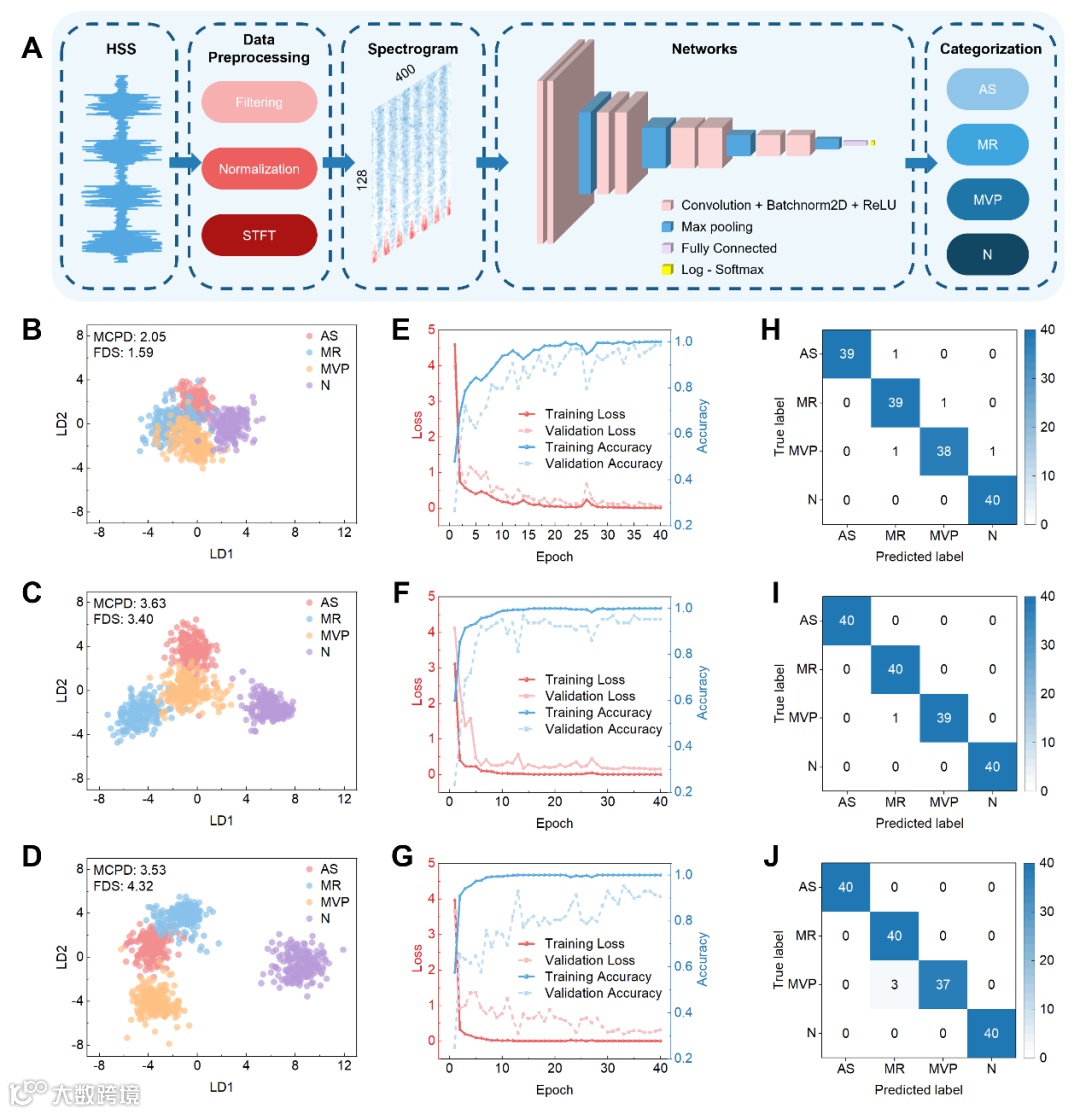 在算法端,研究将采集到的心音信号进行滤波、归一化与短时傅里叶变换(STFT)谱图化处理,并输入深度学习网络 AuscNet-H。结果显示:系统在四类临床心音分类中达到99.375%的准确率;在充气工作条件下实现无假阴性(降低漏诊风险),并在相似疾病的区分上相较商用电子听诊器误分更少。