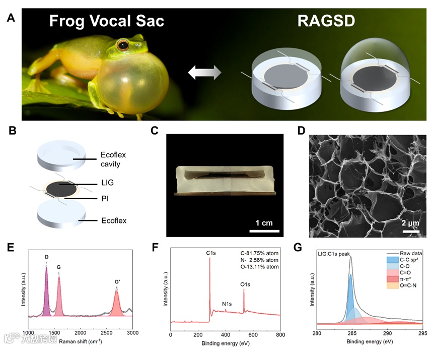 图1. RAGSD结构示意与材料表征:青蛙声囊启发、器件剖面与LIG的SEM/Raman/XPS 表征。