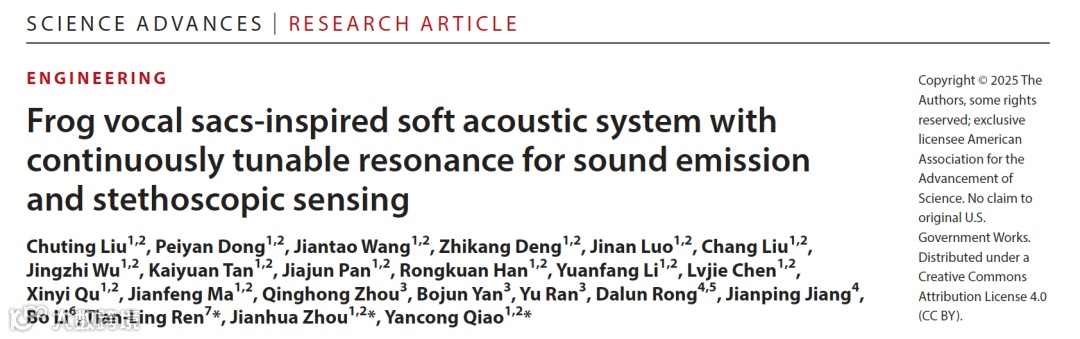 2025年12月17日,研究成果以“Frog Vocal Sacs-Inspired Soft Acoustic System with Continuously Tunable Resonance for Sound Emission and Stethoscopic Sensing”为题发表于Science Advances。硕士研究生刘楚亭为论文第一作者。