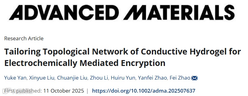 相关论文以“Tailoring Topological Network of Conductive Hydrogel for Electrochemically Mediated Encryption”为题发表在Advanced Materials上,燕宇珂、刘欣悦、刘传杰博士为论文共同第一作者。