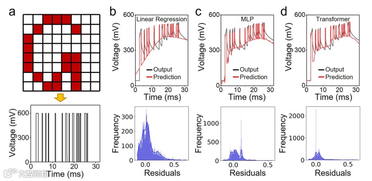 图5. 基于RAC-Gel的抗机器学习攻击性能。a) 图案编码过程示意图,展示了一个64像素矩阵图案(上)及其经时间序列编码后的脉冲输入信号(下)。b–d) 采用不同机器学习模型(线性回归、多层感知机MLP、Transformer)对RAC-Gel输出信号进行预测的结果。每个子图中,上方面板比较了实际输出信号(黑线)与预测信号(红线),下方面板展示相应的残差分布。b) 线性回归模型预测精度较低,残差显著偏离正态分布。c) MLP模型在一定程度上提升了预测精度,但残差分布仍未达到理想的正态形态。d) Transformer模型进一步改善了预测性能,但残差分布依旧呈双峰特征,未能满足正态分布要求。