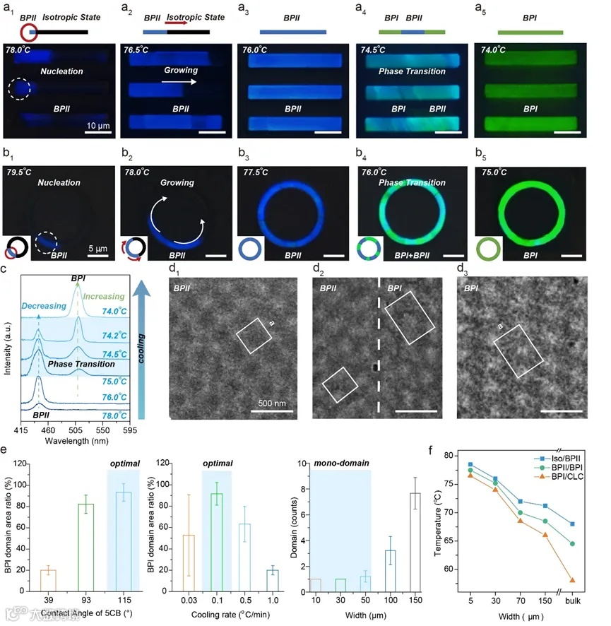 图2. 基于软陷域组装策略的单畴BPLCs原位观测与优化。(a)-(b) BPLCs阵列示意图与原位POM图像。冷却过程中,BPII将在局域结构顶点处成核(a1, b1),随后沿微沟槽定向生长(a2, a3, b2, b3),最终完成向BPI的均匀相变(a4, a5, b4, b5); (c) BPLCs直线微阵列从各向同性态到BPII及BPI的原位反射光谱。(d) BPLCs相变过程的透射电子显微镜图像:BPII{100}、BPII/BPI、BPI{110};(e) 通过精确调控表面润湿性、冷却速率及几何结构实现BPLCs阵列优化。(f) 微沟槽宽度与BPLCs相变温度的关系。