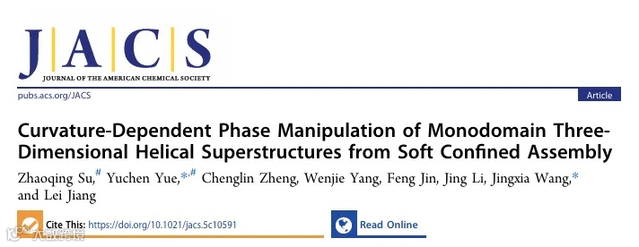 2025年12月19日,该研究成果以“Curvature-dependent Phase Manipulation of Mono-domain Three-dimensional Helical Superstructures from Soft Confined Assembly”为题发表在Journal of the American Chemical Society。该文章通讯作者为王京霞研究员、岳钰琛博士。中国科学院理化所博士生苏钊清和岳钰琛为文章共同第一作者。理化所李敬工程师及北京石油化工学院金峰教授为其中的激光测试提供帮助。中国科学院理化所江雷院士为本研究提供了专业指导和帮助。作者同时感谢上海同步辐射中心(SSRF)提供BL10U1光束线用于采集同步辐射超微透射X射线散射数据。