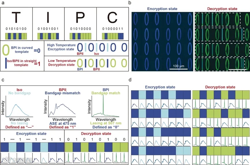图5. 整合相位状态、结构色、形状及激光信号的四模态光学加密技术。(a)基于不同相位状态BPLC的“TIPC”信息加密模型。加密状态下,“0”与“1”分别以BPII(蓝色)和各向同性(无带隙)表示。冷却后,二进制编码转变为绿色BPI表示“0”,蓝色BPII表示“1”,呈现解密状态;(b) 编密与解密状态下BPLC的POM图像(比例尺:100 μm);(c) 基于独特激光信号的“TIPC”信息加密模型。加密状态下,“-”表示无激光(各向同性),“I”表示475 nm处受激辐射(BPII)。冷却后,“0”由507 nm处激光(BPI)表示,“1”仍为475 nm处受激辐射(BPII),呈现解密状态; (d) 处于加密与解密状态的BPLC激光信号。图(d)中观测到的独特激光信号与图(b)所示编码微腔阵列呈一一对应关系。