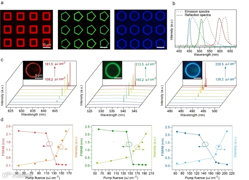 图3. BPLCs微腔阵列的激光性能。(a)具有不同几何结构和带隙的BPLCs微腔阵列荧光显微镜图像:四边形环(红色)、五边形环(绿色)和六边形环(蓝色)。(b) 通过调节相位带隙使微腔反射光谱(实线)与荧光染料发射峰匹配的谱图:香豆素-500(蓝色,发射带隙 λ=492 nm)、香豆素-6(绿色,λ=538 nm)及DCM(红色,λ=643 nm)。通过精确调控手性掺杂剂浓度实现晶格参数控制以获得带隙。(c) 不同泵浦通量下BPLCs微腔阵列激发激光光谱。插图展示微腔阵列的偏振显微镜图像。(d) 单个微腔在不同泵浦通量下激发阈值上下数据的典型输入输出曲线,包括半高全宽(FWHM)及最佳拟合曲线,揭示出128 μJ/cm²(红色)、150 μJ/cm²(绿色)和168 μJ/cm²(蓝色)的激光阈值。