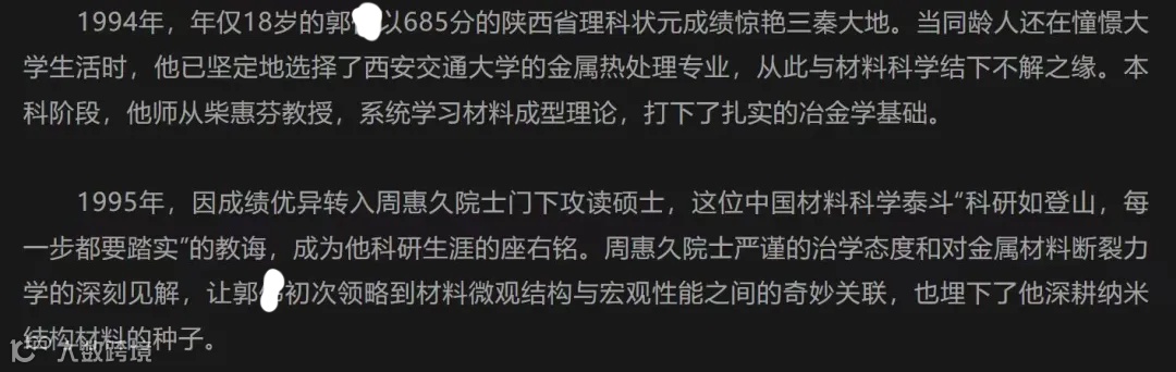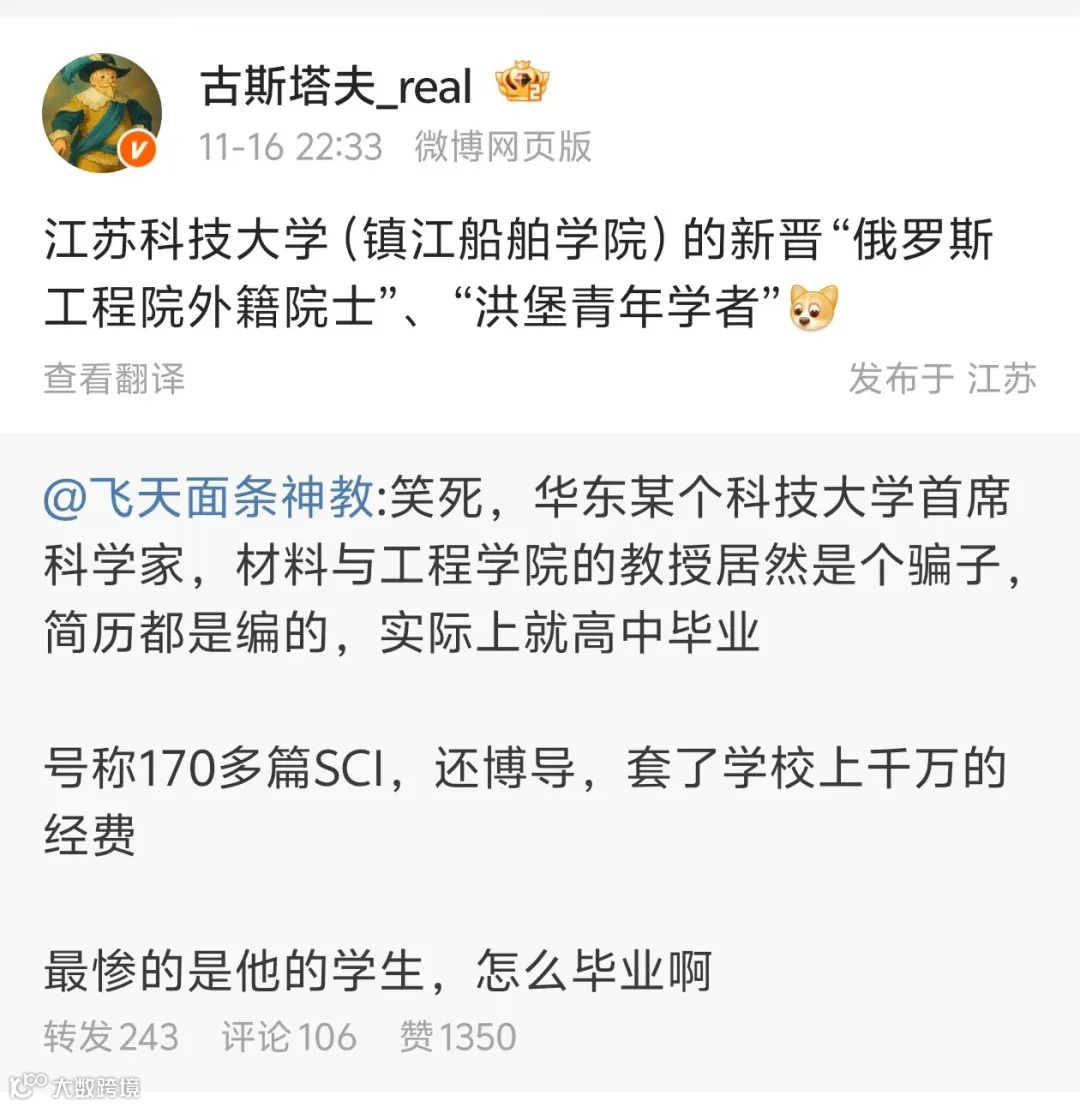 郭某百度百科显示,江苏某大学首席科学家、材料科学与工程学院教授、博士生导师,国家重大人才工程A类创新人才,德国洪堡青年学者,美国金属材料学会杰出科学家,2025年当选俄罗斯工程院外籍院士。