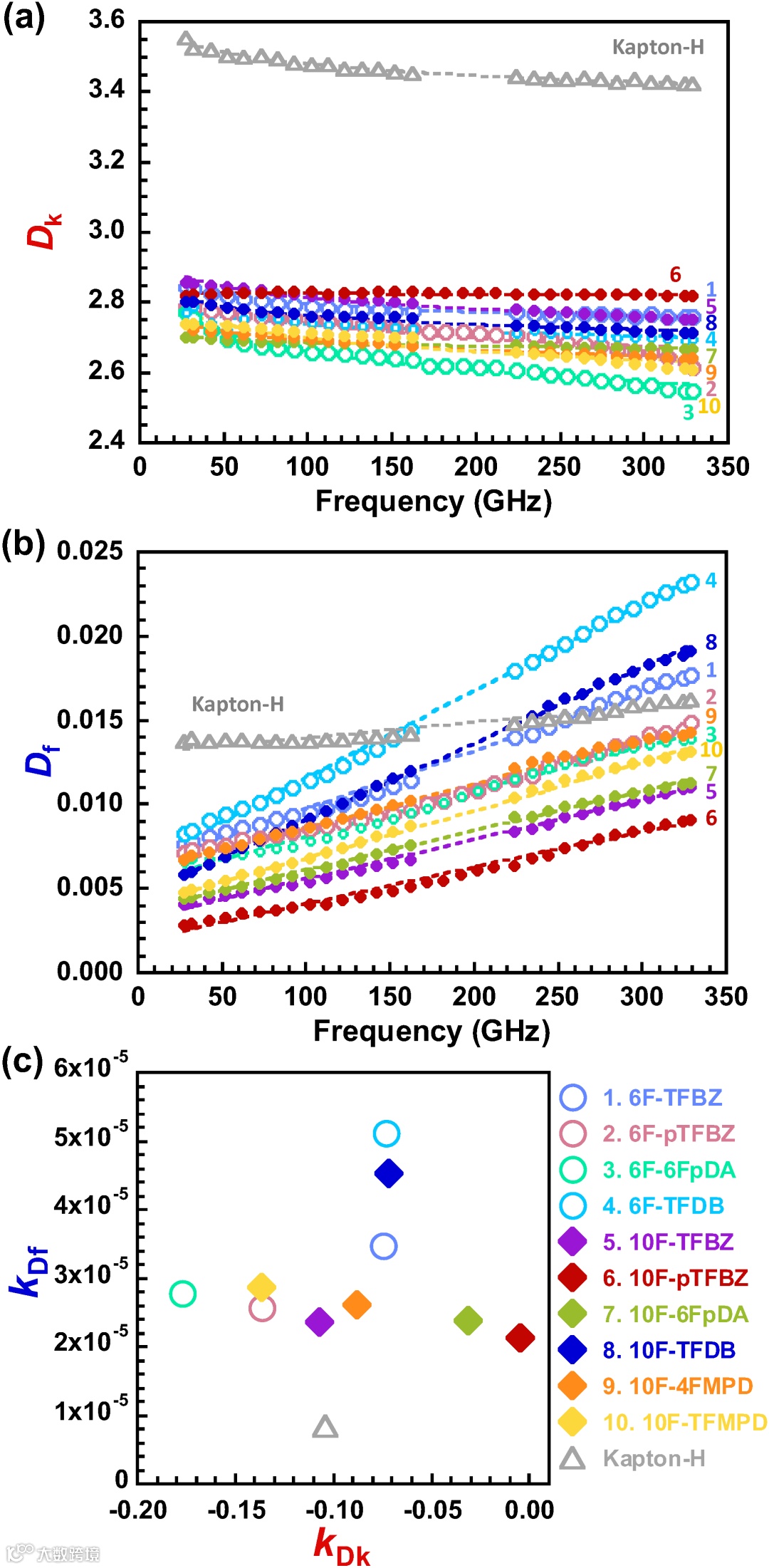 高频(>100 GHz)下,部分结构的Df仍能维持在0.01以下,远优于常规Kapton-H等商用聚酰亚胺。