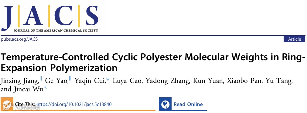 2025年10月2日,该工作以“Temperature-Controlled Cyclic Polyester Molecular Weights in RingExpansion Polymerization”为题发表在《J. Am. Chem. Soc.》上(DOI:10.1021/jacs.5c13840)。文章第一作者是天水师范大学姜金星副教授和兰州大学的博士生姚舸。