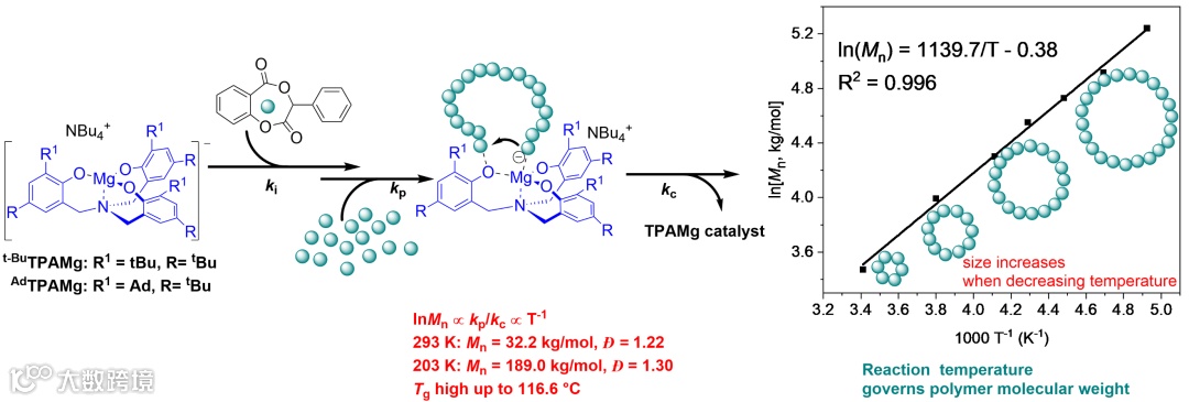 方案1:TAPMg催化温度控制的环状水杨酸与扁桃酸交替共聚物分子量的示意图。ln(Mn)与1/T呈线性。