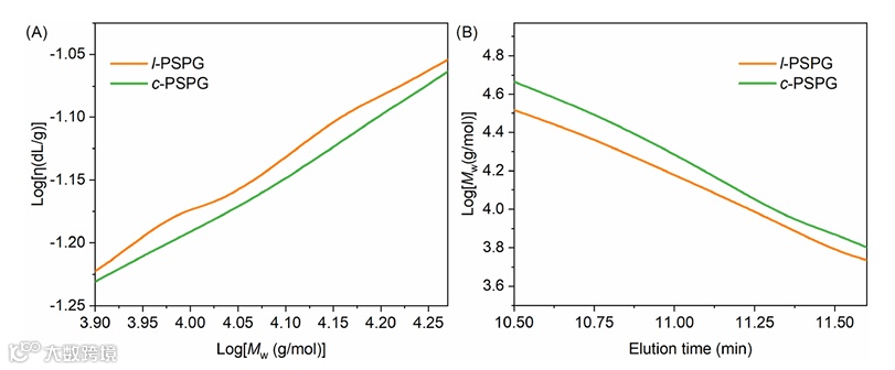 图3:(A) 线性和环状PSPG的特性黏度与绝对分子量的双对数图;(B) 线性和环状PSPG的分子量对数与洗脱时间的关系图。