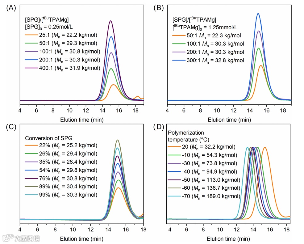 图1:(A)[SPG]0 = 0.25 mol/L,不同[SPG]0/[tBuTPAMg]0 比例的GPC堆叠图;(B)[tBuTPAMg]0 = 1.25 mmol/L,不同[SPG]0/[tBuTPAMg]0 比例的GPC堆叠图(C)不同转化率下的GPC堆叠图(D)不同聚合温度下的GPC堆叠图。