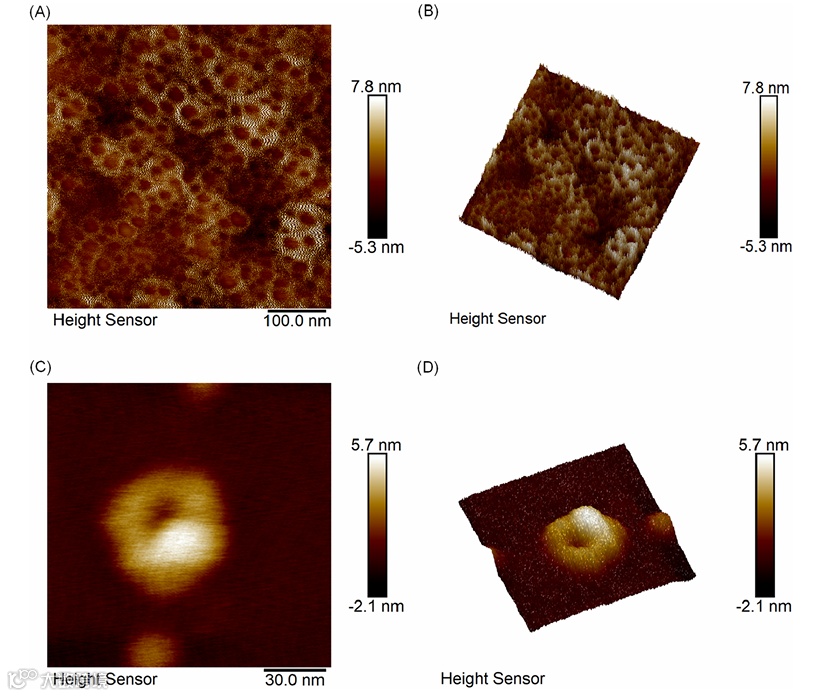 图4:环状PSPG的AFM二维、三维高度传感数据图:浓度 (A) 0.1 mg/mL and (B) 0.0001 mg/mL。
