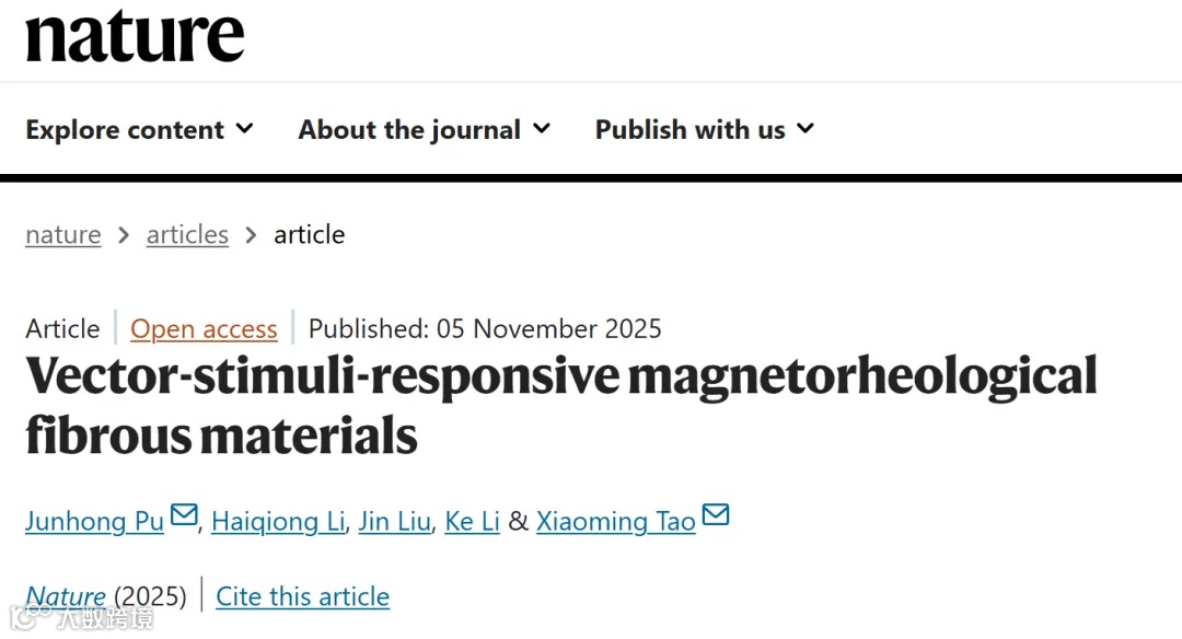 2025年11月5日,相关工作以 “ Vector-stimuli-responsive magnetorheological fibrous materials ” 为题在Nature上发表研究论文。蒲俊宏助理教授为第一作者兼通讯作者,陶肖明教授为共同通讯作者。