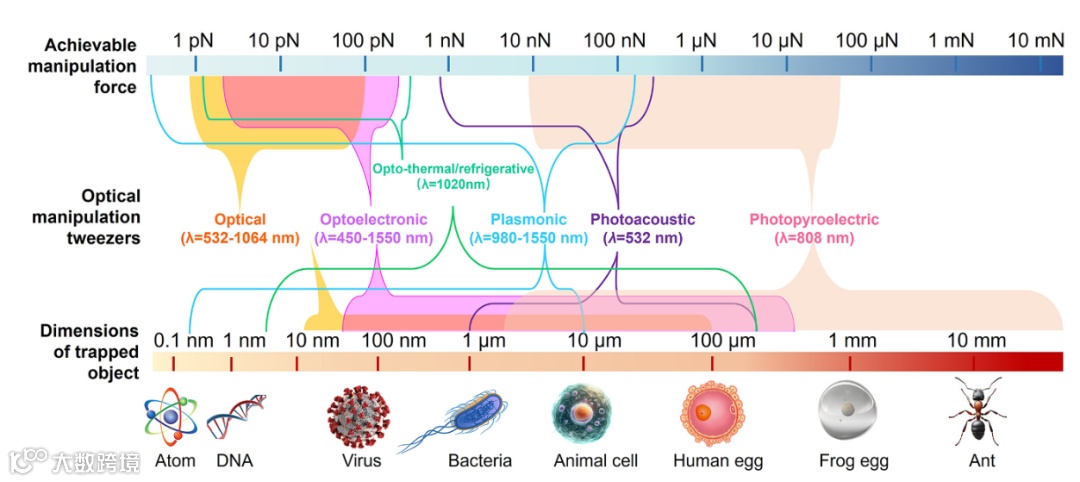 图2代表性光学操控镊子的操控力范围和捕获物体的尺寸