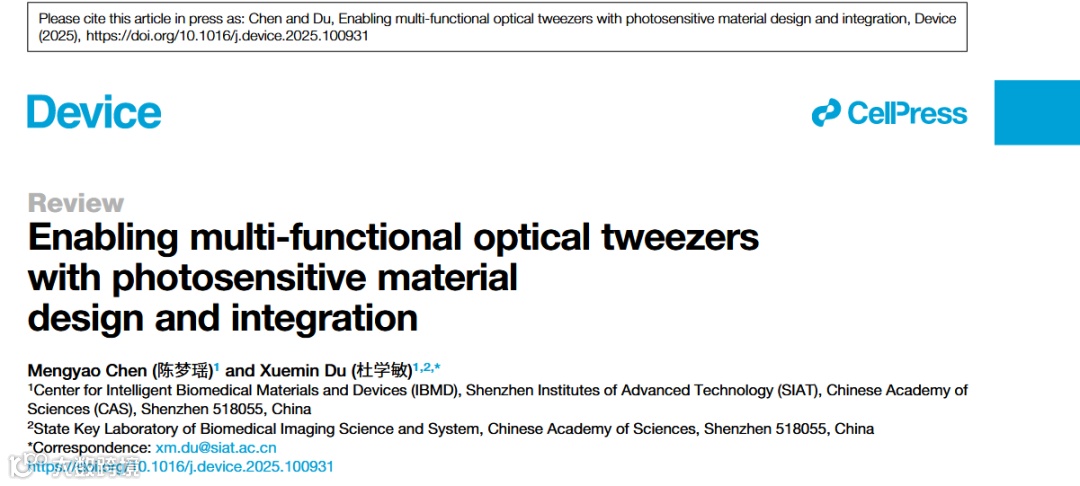 近日,中国科学院深圳先进技术研究院智能医用材料与器械研究中心杜学敏研究员团队在国际学术期刊《Device》上在线发表了题为“Enabling multi-functional optical tweezers with photosensitive material design and integration”的综述文章。该文章深入地探讨了通过光敏材料的设计与集成,克服传统光学镊子在操控力大小、粒子尺寸限制、材料透明性要求及热损伤风险等方面的固有局限,为实现多尺度、多材料、多环境下的非接触式高精度操控提供了创新思路与技术路线。