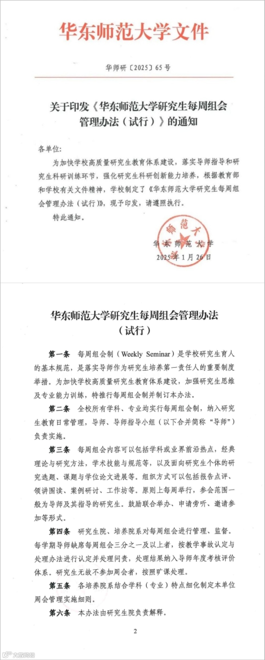 今年初,《华东师范大学研究生每周组会管理办法(试行)》规定,全校所有学科、专业均实行每周组会制,纳入研究生教育管理日常,每学期缺席三分之一及以上的导师按“教学事故认定与处理办法”进行认定并处理问责,无故不参加的研究生按旷课处理。这意味着,组会将成为贯穿导师、学生们日常考核的一项内容。
