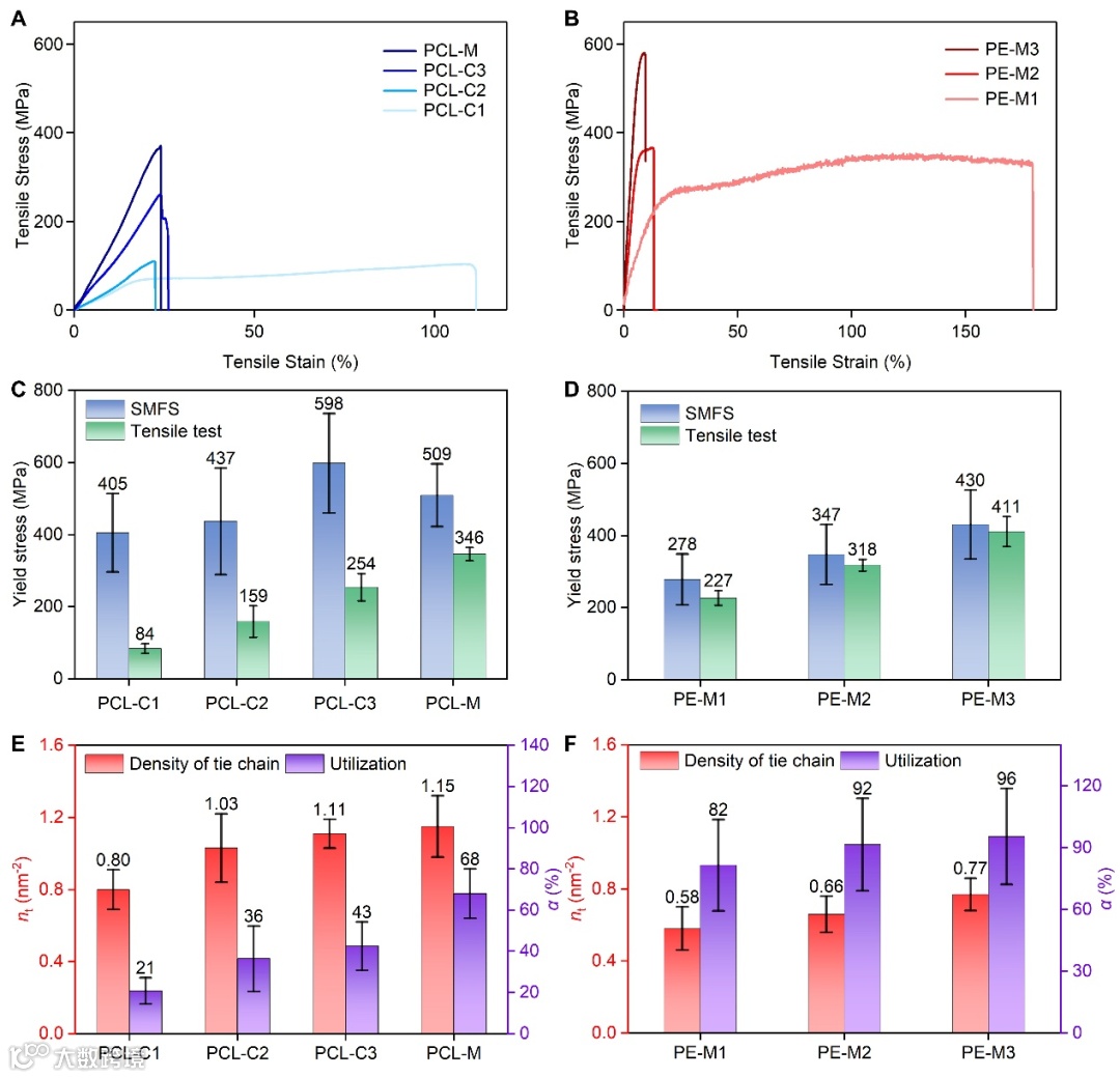 图3. 拉伸比对系带分子密度(nt)与利用率(α)的影响。(A-B)PCL与PE纤维的拉伸应力-应变曲线。(C-F)实际屈服应力(σy)、SMFS预测的最大屈服应力(σSMFS)、nt与α随拉伸比变化图。