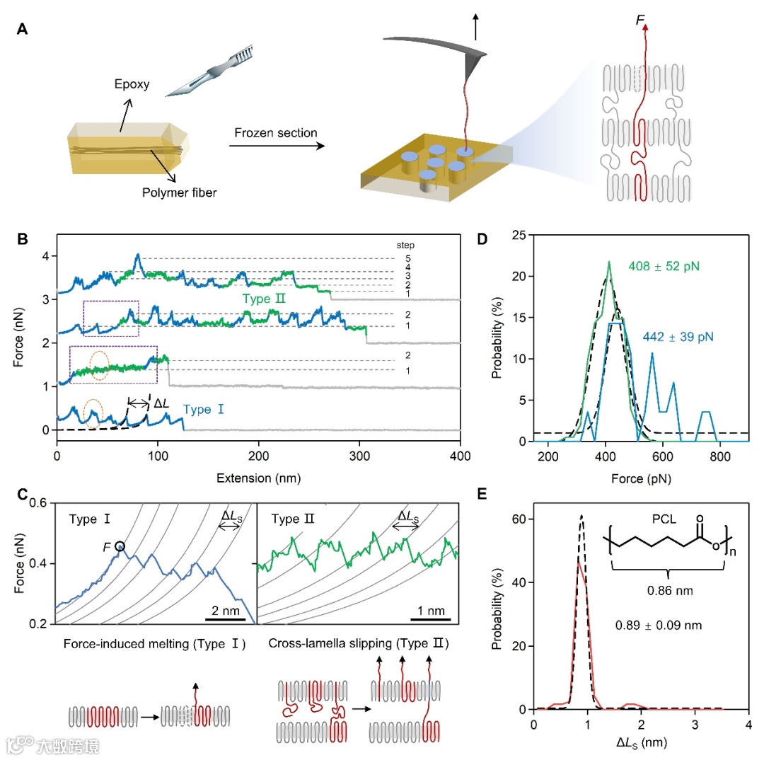 图1. PCL纤维的单分子拉伸实验。(A)纤维样品制备及单分子拉伸实验示意图。(B)典型的力-拉伸长度(F-E)曲线。Ⅰ型与Ⅱ型曲线分别以蓝色和绿色标注。(C)力诱导熔融(Ⅰ型)和层间滑移(Ⅱ型)的力曲线及相应的链行为示意图。 (D) PCL纤维中熔融力(蓝线)与层间滑移力(绿线)的分布直方图。 (E) PCL纤维中小锯齿峰间距的分布直方图。