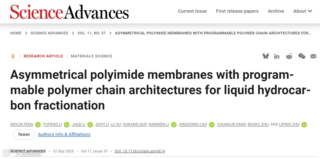 相关论文以“Asymmetrical Polyimide Membranes with Programmable Polymer Chain Architectures for Liquid Hydrocarbon Fractionation”为题发表在Science Advances上,论文第一作者是浙江大学博士后冯炜林,共同第一作者为浙江大学绍兴研究院研发工程师李付鹏,合作者包括浙江大学朱宝库教授、深圳理工大学李南文教授与中国科学院高能物理研究所曹兴忠教授等。