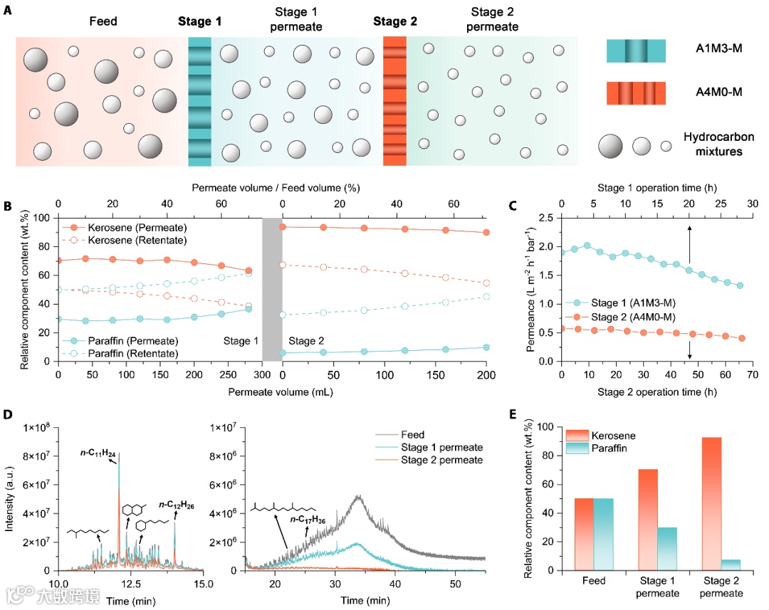 图4 基于聚酰亚胺膜的烃类混合物膜分馏过程。(A)碳氢化合物二级膜分离示意图;(B)分离过程中煤油与石蜡组分的相对含量;(C)分离过程中膜渗透率变化;(D)进料液、一级滤出液、二级滤出液的气相色谱曲线;(E)进料液、一级滤出液、二级滤出液中煤油与石蜡组分的相对含量。