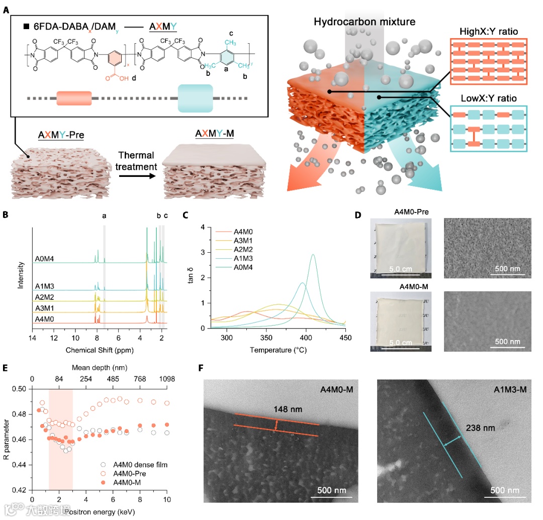 图1 分子工程化设计非对称聚酰亚胺膜的形成过程与形貌特征。(A)聚合物合成、相转化膜热处理、膜法烃类分离过程示意图。(B)聚合物的1H NMR谱图。(C)聚合物的DMA曲线。(D)相转化基膜与热处理膜的实物图与电镜图。(E)相转化基膜与热处理膜的慢速正电子湮灭R参数。(F)A4M0-M膜与A1M3-M膜的断面TEM图。