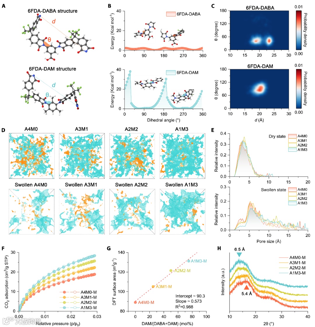 图2 分子工程化聚酰亚胺的微孔分析。(A)6FDA-DABA和6FDA-DAM片段的扭转角(θ)和末端酸酐桥连氮之间的原子距离(d);(B)分子片段的扭转势能曲线;(C)6FDA-DABA和6FDA-DAM片段d和θ的二维分布;(D)干态或甲苯溶胀态下聚酰亚胺微孔模型中联通孔(青色)和非联通孔(橙色)分布。干态使用直径为1.7 Å的探针,溶胀态使用直径为4.0 Å的探针;(E)干态或甲苯溶胀态下的聚酰亚胺孔径分布;(F)273 K 下聚酰亚胺膜的CO2等温吸附曲线;(G)聚合物DFT比表面积与是 DAM 摩尔百分比的关系;(H)不同聚酰亚胺膜的XRD衍射谱图。