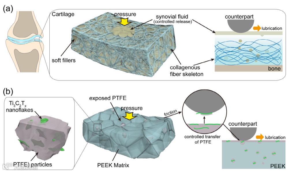 聚醚醚酮(PEEK)广泛应用于轻量化结构,但纯PEEK自身润滑性差制约了其进一步发展,而传统添加聚四氟乙烯(PTFE)润滑剂的方法润滑效率低下,且过多的PTFE会导致材料力学性能的显著衰退。因此,如何实现润滑相的可控分布与定向迁移,从而在摩擦界面构建稳定、有序的润滑层,已成为该领域面临的重大挑战。受人体软骨“在应力控制下释放滑液”机制的启发,巧妙地将二维材料MXene(Ti₃C₂Tₓ)作为“调控器”,与PTFE润滑剂协同作用,成功制备出新一代PEEK基复合材料。