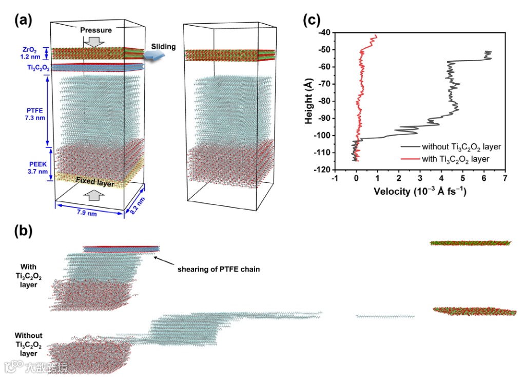 近日,西北工业大学材料学院杜乘风副教授及其合作研究团队受人体关节软骨“在应力控制下释放滑液”机制的启发(图1a),创新性地提出仿生设计策略,将MXene作为润滑相PTFE释放和转移的响应调控器,实现PTFE的控制释放。通过分步混合与热压烧结工艺,使MXene纳米片与PTFE微粒优先结合,再分布于PEEK基体之中,制备出一系列具有精确组成的PEEK/MXene/PTFE复合材料(图1b)。这一材料制备策略确保了MXene与PTFE在基体中形成均匀分布的空间复合结构,为后续的成分及性能调控奠定了基础。摩擦学测试结果表明,MXene的引入显著改变了材料的摩擦学行为。其中,含5 wt% MXene和10 wt% PTFE的复合材料表现出最优异的综合性能:摩擦系数降低至0.060,比未添加MXene的样品降低了26.83%(图2);并且磨损率保持在10-6 mm3/N·m量级。与已有报道的同类型复合材料相比,该系列复合材料在润滑性能与抗磨性能方面均处于领先水平。在保障最佳摩擦学综合性能的同时,MXene的添加也使材料的力学性能得到提升:抗压强度增加11%,且工程应变可增加一倍(图3)。根据分子动力学模拟(图4),MXene通过与PTFE形成强界面相互作用,使剪切滑移面被限制在PTFE层的最顶部区域,实现了低能量的PTFE分子间滑移。这一过程可精确调控PTFE在摩擦时的转移行为,从而显著降低摩擦阻力和材料磨损。