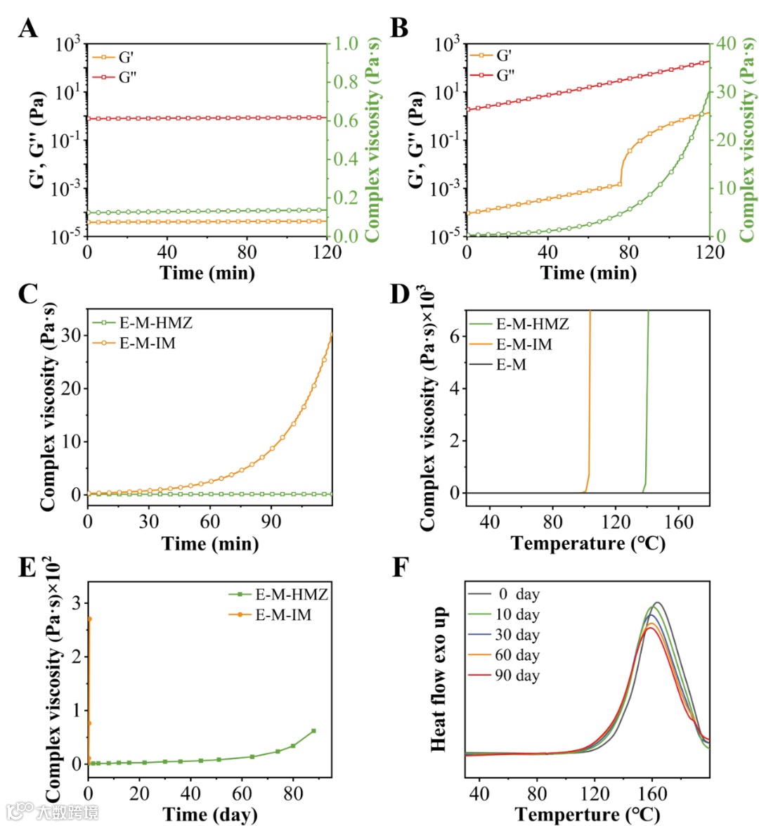 差示扫描量热实验(DSC)表明,HMZ显著降低双酚A环氧/甲基六氢苯酐(MHHPA)体系的起始固化温度并大幅提升反应速率,体现其高效催化活性;相较于直接添加咪唑的体系,HMZ体系具有更高的固化峰温和活化能,凸显优异潜伏性能(图3)。尤为突出的是,在室温存放超过90天后,体系仍保持良好流动性,固化放热行为无明显衰减。