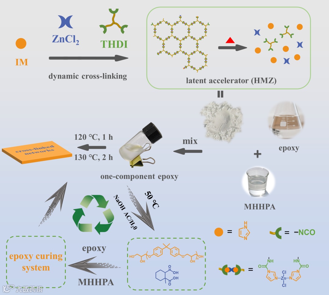 针对这一挑战,江南大学化学与材料工程学院马松琪教授团队在潜伏型固化剂设计方面持续深耕,提出了“动态交联-可控溶解”潜伏机制,在储存稳定性与固化效率的平衡调控方面已超越国外同类产品;同时近10年在高性能可回收环氧树脂方面开展了大量研究,实现了回收与性能的平衡。近日,团队进一步构建出一种基于“咪唑脲键–金属配位”双重动态交联策略的新型潜伏型促进剂HMZ,成功开发出首例兼具卓越储存稳定性、快速热响应固化能力与完全可回收性的单组分环氧树脂体系(图1),相关成果发表于国际高分子权威期刊《Macromolecules》。