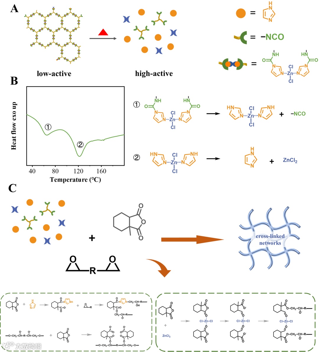 机理研究(图5)表明,室温下高活性咪唑被牢固锚定于咪唑脲键与Zn²⁺配位构成的交联网络中,有效抑制其与环氧基团接触,大幅降低反应活性;当加热至120 °C附近,动态键选择性断裂,迅速释放出游离咪唑与ZnCl₂,二者协同催化酸酐与环氧基团发生快速开环聚合反应,45分钟内实现84%的固化程度,实现潜伏与高效固化的统一。