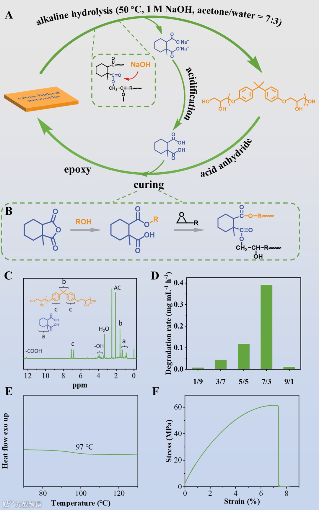 更值得强调的是,该体系固化网络富含可水解酯键,可在温和条件(50 °C,NaOH/丙酮/H₂O)下高效降解,所得产物富含羧基与羟基,无需复杂纯化即可作为复合固化剂重新用于配方,循环使用后仍保持良好性能,实现闭环回收与资源再利用(图6)。