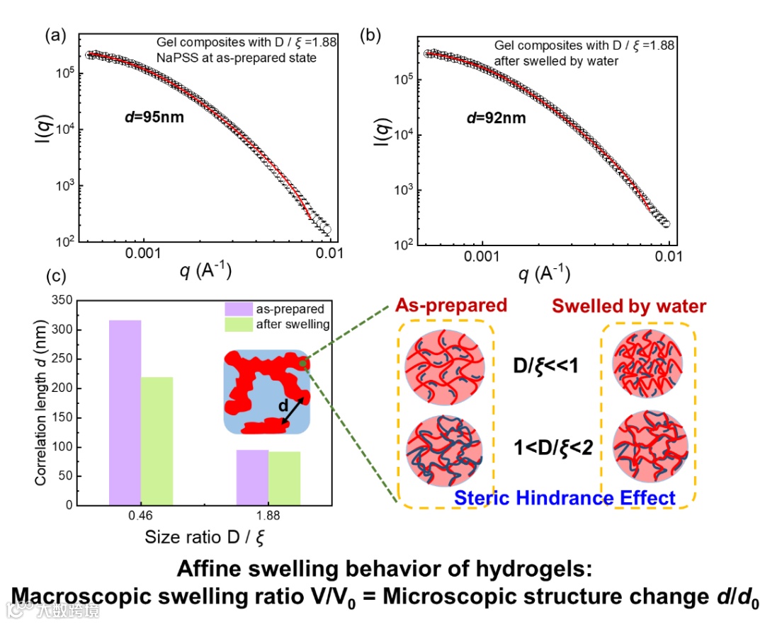 此外,微小角中子散射(VSANS)测试结果表明该凝胶复合物具有仿射溶胀行为(Affine Swelling Behavior),即在溶胀前后凝胶的宏观尺寸变化与凝胶的微观结构尺寸变化是一致的。