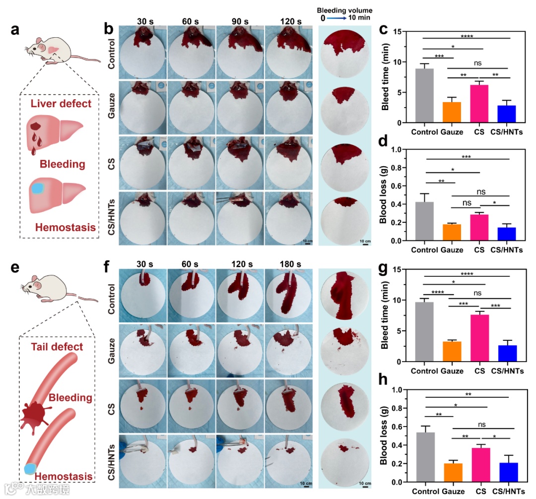 图8. CS/HNTs在小鼠肝脏和尾部出血模型中的止血效果。(a) 小鼠肝脏止血过程示意图。