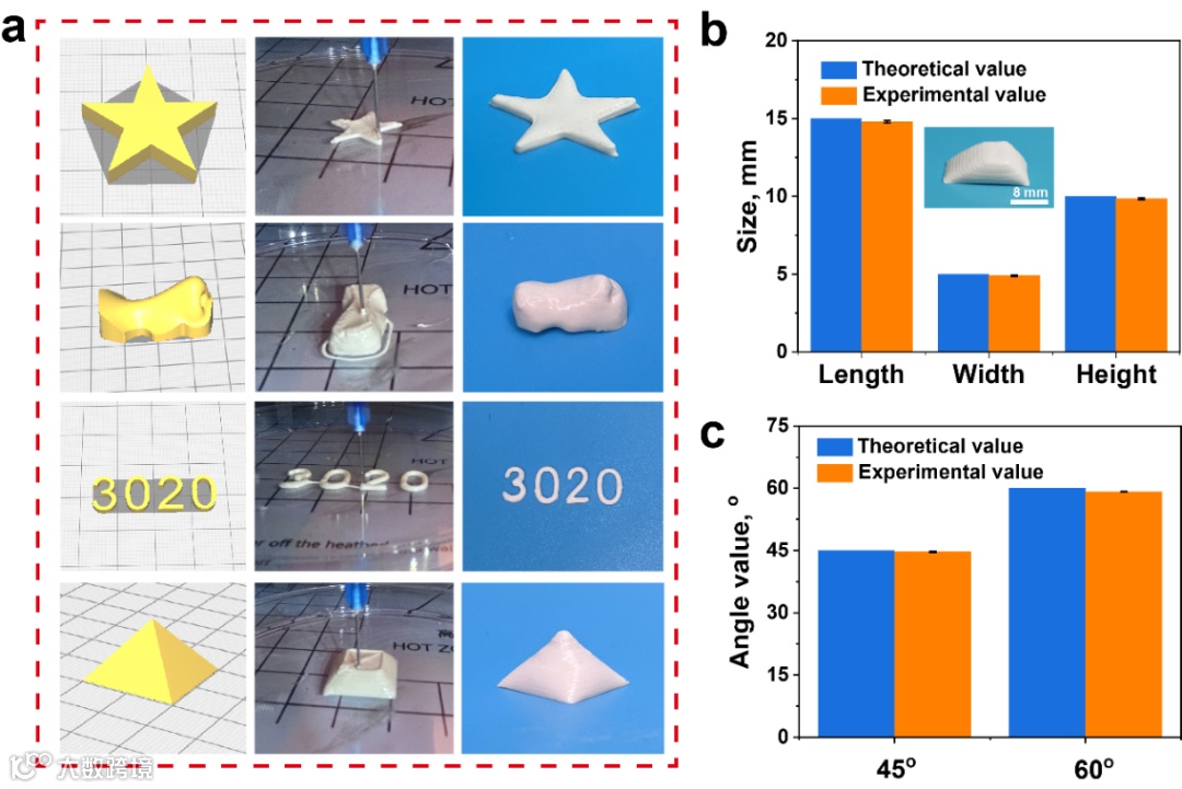 CS/HNTs墨水具备可打印性和保持一定形状,因此采用CS/HNTs墨水打印出各种复杂的模型,以测试其形状保真度。如图5,CS/HNTs墨水能够按照设定的模型打印出相对应的模型,例如五角星、鼻子、3020数字和金字塔。通过角度为45o和60o的梯形模型验证其形状保真度。如图5b-c,所打印出来的梯形模型的长、宽、高和角度几乎与理论设定值相同,这说明CS/HNTs墨水具备较好的形状保真度。