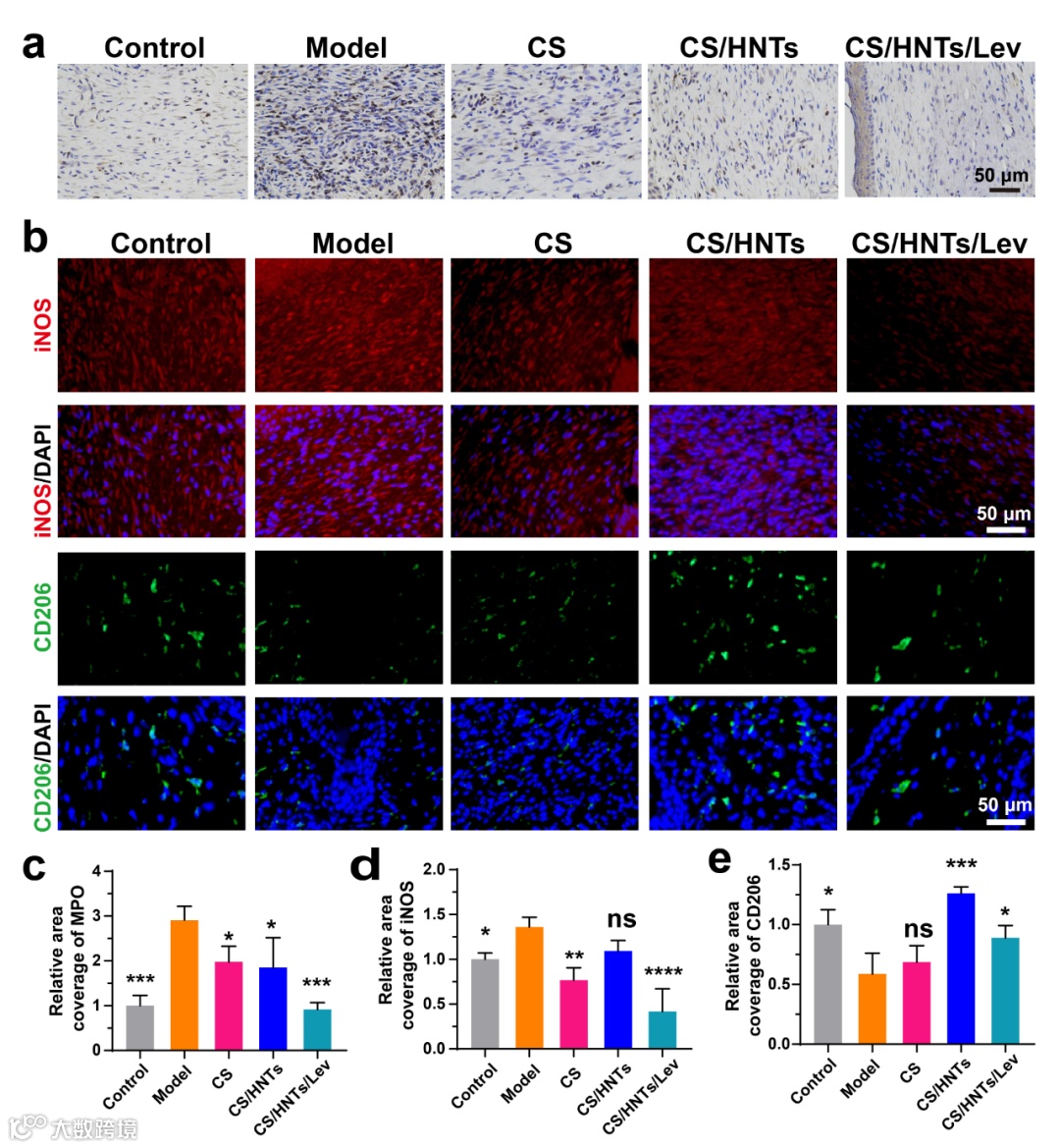 图11. 组织形态学分析。(a) MPO 的免疫组织化学染色。(b) iNOS 和 CD206 的免疫荧光染色。(c) MPO的定量分析。(d) iNOS的定量分析。(e) CD206的定量分析。