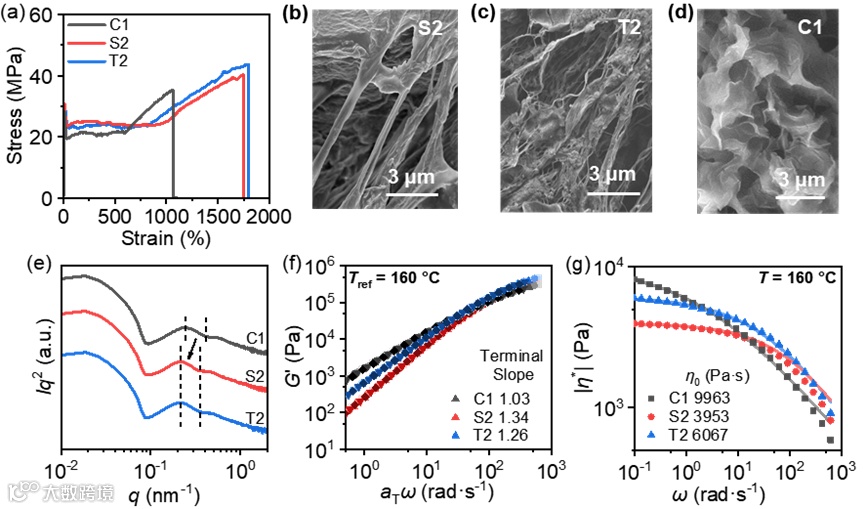 图3.(a)C1、S2 和 T2 的拉伸应力-应变曲线;(b)S2、(c)T2和(d)C1 的扫描电子显微镜(SEM)图像;(e)C1、S2 和 T2 的小角度 X 射线散射(SAXS)曲线;小振幅振荡剪切(SAOS)测试:(f)参考温度(Tref)为160 °C下的G' - aTω 曲线;(g) 160 °C 下C1、S2 和 T2 的 |η*| - ω曲线(点代表实验值,实线代表Cross 模型拟合曲线)。