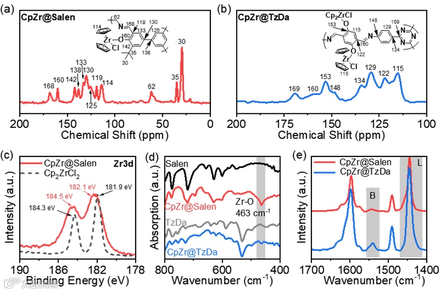 图2.(a)CpZr@Salen 和(b)CpZr@TzDa 的 13C CP/MAS 核磁共振谱图;(c)Cp2ZrCl2 和CpZr@Salen 中 Zr(3d3/2) 和 Zr(3d5/2) 的结合能;(d)COF-Salen、COF-TzDa、CpZr@Salen 和 CpZr@TzDa 的傅里叶变换红外光谱;(e)CpZr@Salen 和 CpZr@TzDa 的吡啶红外光谱。