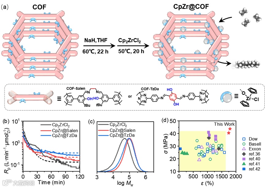 图1.(a)COF-茂金属配合物的合成;(b)110 °C下Cp2ZrCl2和COF-茂金属配合物催化乙烯聚合过程中的乙烯消耗速率曲线(实线表示实验数据,虚线表示模型曲线);(c)Cp2ZrCl2和COF-茂金属配合物合成HDPE的GPC曲线;(d)本文中合成的COF-PE复合材料与Dow、Basell和Exxon的HDPE产品,以及使用其他负载型催化剂或填料的HDPE复合材料性能对比。