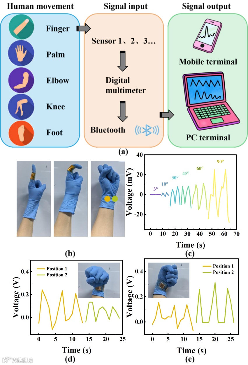 在本研究中,采用数字万用表的蓝牙模块将压电传感器的数据无线传输到移动电话或计算机。接收到数据后,计算机上的专用软件对数据进行处理,将其表示为实时波形(图3a)。这种无线方式使柔性传感系统在监测、定位和数据存储方面具有增强的能力。将压电传感器固定在手指关节和手腕上,可以观察以不同弯曲时输出电压的变化。