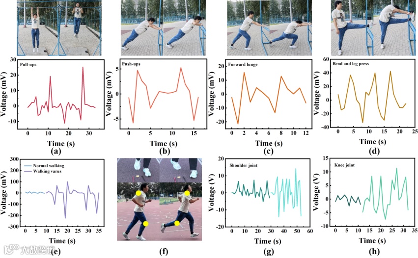 利用便携式设备,他们甚至可以在室外环境中监测人体运动。引体向上是一种增强手臂肌肉和身体协调性的运动,由志愿者进行(图4a)。虽然俯卧撑没有引体向上那么剧烈,但对于想要减肥的健身爱好者来说,仍然是一种有效的运动。电压信号根据志愿者做俯卧撑呈现周期性输出(图4b)。在剧烈运动之前和之后进行伸展运动,不仅对增强肌肉和骨骼力量,而且对减少受伤的风险至关重要。这样的运动可以防止乳酸在肌肉中积累,从而减轻身体疼痛等不适。我们使用单杠进行前蹲弓步,这有效地拉伸了手臂、背部和大腿后部的肌肉,因此是一个很好的整体热身运动(图4c)。此外,在脚踝上安装一个传感器,监测在单杠上进行的弯曲腿部按压练习,为保护腰部、脊柱和大腿内侧提供预防措施(图4d)。