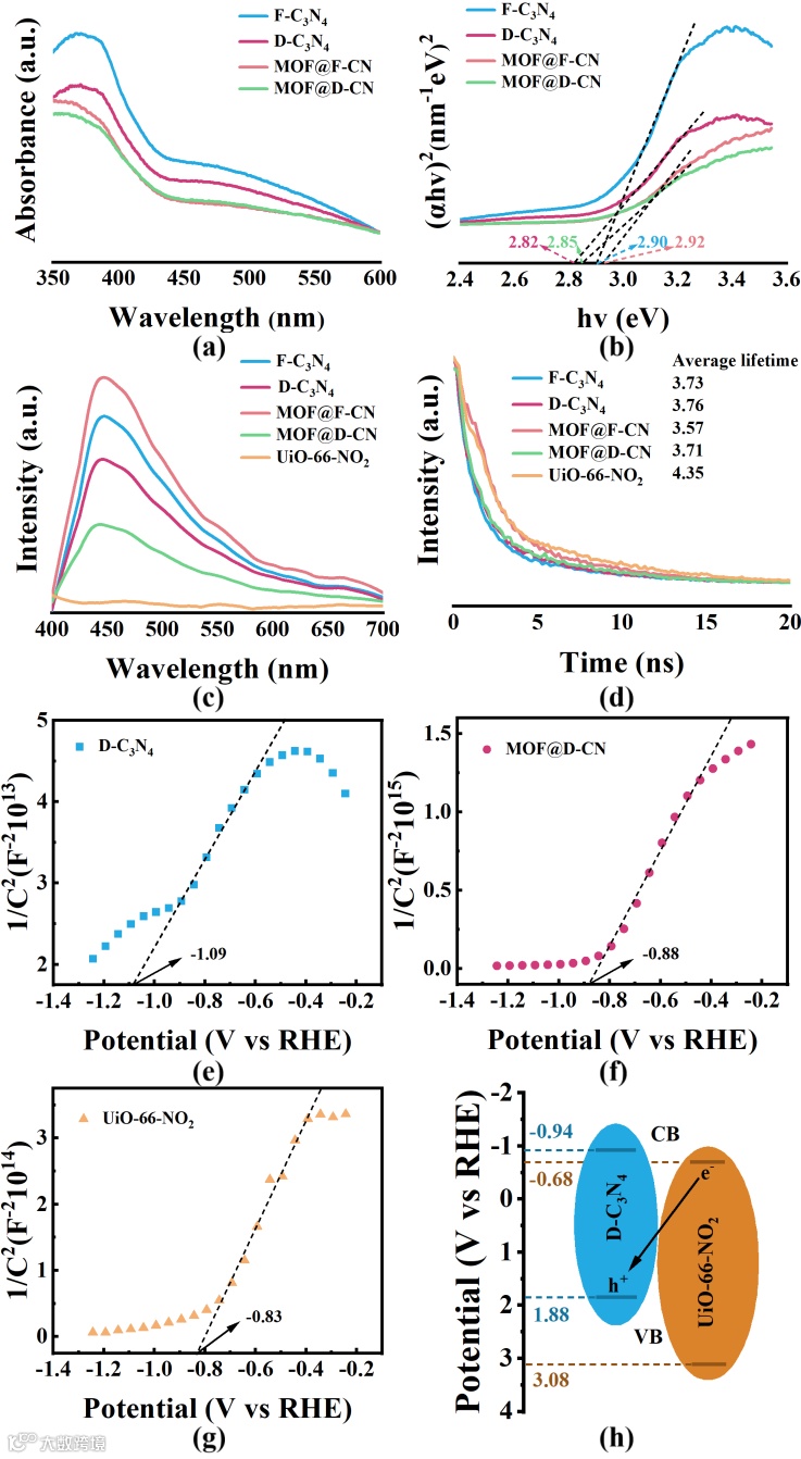 对UiO-66-NO2、g-C3N4和MOF@g-C3N4进行了Mott-Schottky (M-S)分析,确定了这些材料的平带电位(Vfb)。其中,导带(CB)电位相对于Vfb负0.15 V,带隙(Eg)已通过Kubelka-Munk图像确定(图1b)。因此,我们计算出UiO-66-NO2、g-C3N4和MOF@g-C3N4的价带(VB)。与g-C3N4相比,UiO-66-NO2的CB的负电荷更小(图1h),促进了电子从UiO-66-NO2的CB向g-C3N4的VB转移,说明了Z-scheme机制。