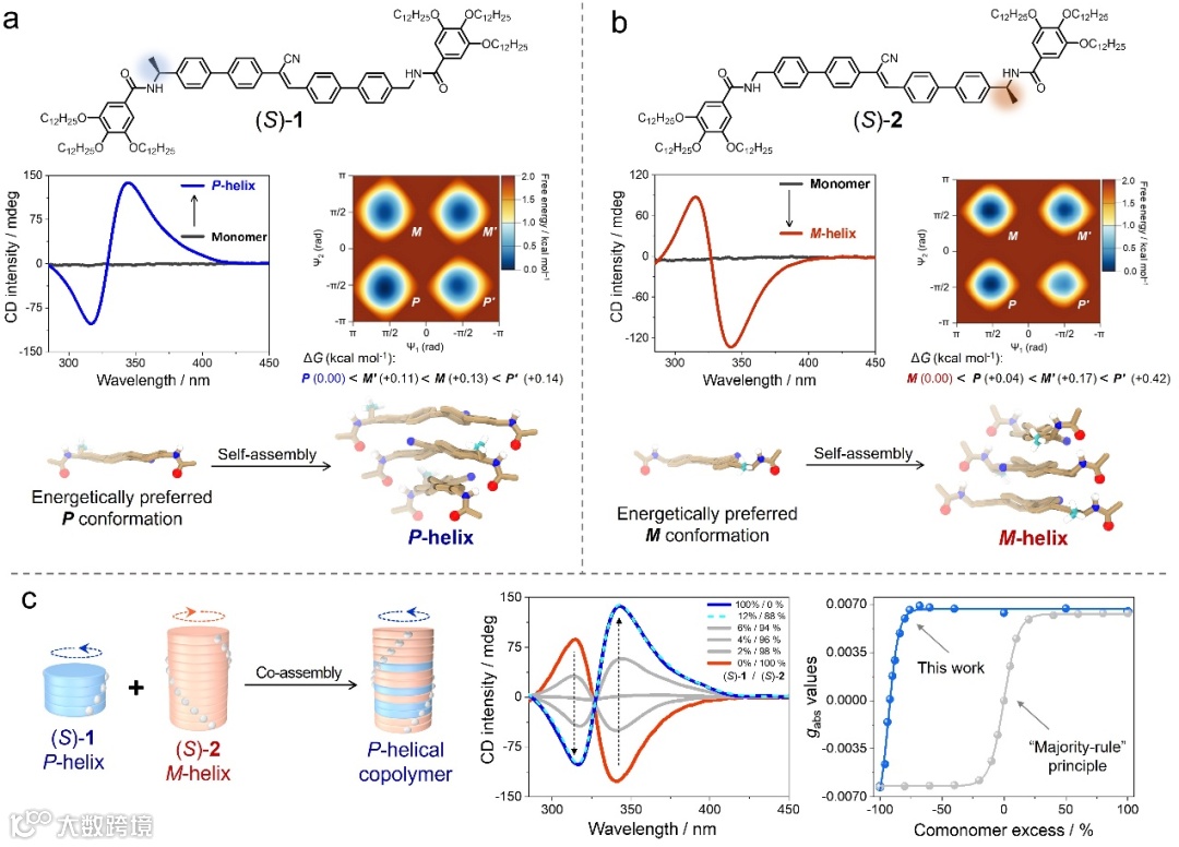 图2. (a)化合物(S)-1,(b)(S)-2的分子结构式、圆二色光谱、分子构象的元动力学势能图、能量优势单体构象以及螺旋聚集体结构。(c)(S)-1/(S)-2超分子共聚合的螺旋手性调控示意图以及相应的圆二色光谱图。