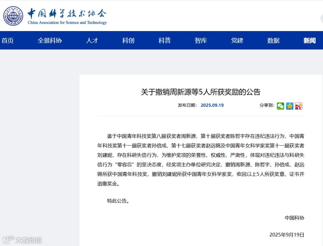 鉴于中国青年科技奖第八届获奖者周新源、第十届获奖者陈哲宇存在违纪违法行为,中国青年科技奖第十一届获奖者孙倍成、第十七届获奖者赵远锦及中国青年女科学家奖第十一届获奖者刘建妮,存在科研失信行为,为维护奖项的荣誉性、权威性、严肃性,体现对违纪违法与科研失信行为“零容忍”的坚决态度,经奖项主办单位研究决定,撤销周新源、陈哲宇、孙倍成、赵远锦所获中国青年科技奖,撤销刘建妮所获中国青年女科学家奖,收回以上5人所获奖章、证书并追缴奖金。
