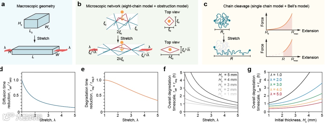 为了深入理解机械拉伸如何影响降解过程,团队建立了多尺度理论模型,将影响因素拆分为三个层次:(1) 宏观几何变薄。拉伸减少了水凝胶厚度,酶扩散路径更短(图三a);(2) 网络网孔放大。拉伸扩大高分子网络的网孔,加快酶的扩散速度(图三b);(3) 分子链张力提升。被拉直的分子链更容易发生酶切断裂 (图三c)。模型预测的降解时间与实验结果高度吻合,并能够揭示一些实验表征难以直接观测到的结论。比如,在低到中等拉伸比时,宏观几何变薄效应占主导;而在高拉伸比时,分子链张力提升的作用更明显,直接加速分子键断裂(图三下)。